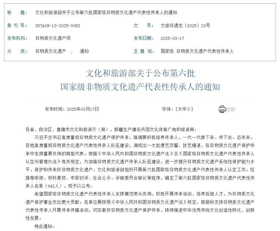 2025年3月17日,《文化和旅逛部关于第六批国度级非物质文化遗产代表性传承人保举人选名单的通知》发布。名单共有942人,此中,樊生华、林振传等19位茶叶制做身手及相关习俗范畴代表性项目传承人入选,目前国度级制茶身手及其相关习俗传承人数量已达44人。