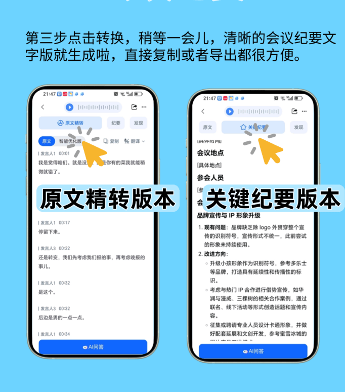 现正在我用它的流程出格顺:先传录音,选“会议纪要”模式,等个几分钟(视录音长度),就能拿到带措辞人标注的 transcript、摘要和环节词。我会先看摘要,有没有漏掉新整改办法,如果没写,间接去 transcript 里找对应的措辞人部门,快得很。然后把环节词拾掇一下,好比“原料农残”“出产流程优化”,这些都是纪要要凸起的。最初查抄术语,确认没问题,一份完整的纪要就搞定了。结果是实的较着!伴侣他们之前拾掇一次纪要要俩⼈一天,现正在一小我俩小时就够,时间省了75%不说,错误率还降了九成。之前人工转成“冷鲜运输”,仍是带领查抄才发觉;用听脑AI间接标对了“冷链运输”,压根不消回头改。还有一次会议俩小时,人工拾掇得翻三遍录音,用它十分钟就出了摘要,沉点全正在里面,伴侣说现正在再也不消熬夜赶纪要了。